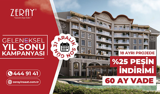 Zeray İnşaat, deneyimi ve standartları değiştiren proje anlayışı ile Türkiye gayrimenkul sektörünün en önemli oyuncularından biri olmayı başardı. Zeray, geleceği öngören yönetim anlayışı, yapı alanında uzmanlığa sahip kadrosu ve deneyimli işgücüyle Türkiye’nin geleceğine yatırım yapıyor. Aynı zamanda da yaşama değer katıyor.Alışılmışın dışında projeleriyle Zeray, şehir içinde ve dışında yeni değerler yaratan farklı yaşam merkezleri gerçekleştirmek, yeni yaşam alanlarını hayata katmak için var. Doğal dengeyi koruyan yaklaşımı, yarattığı eşsiz çevre düzeniyle yatırım yaptığı alanlara değer kazandıran ve her yatırımda standartları yükseltmeyi amaçlayan bir vizyona sahip. Çünkü daha iyi bir yarın bekleyen pek çok hayat var.Zeray’ın konut sahibi olmayı kolaylaştıran adımlarından biri de her yıl düzenlediği Geleneksel Yıl Sonu Kampanyası.Bu yıl 1 Aralık ve 31 Aralık 2023 tarihleri arasında gerçekleşen ve konut sahibi olmak isteyenlere 18 ayrı proje sunan Geleneksel Yıl Sonu Kampanyası yine büyük bir ilgi ile karşılandı. Yeni bir evde yeni bir hayata başlamak isteyen potansiyel alıcılar, beraberinde birikimlerini en çok kazandıran enstrüman olan gayrimenkulde değerlendirmeyi amaçlayan yatırımcılar, kampanyaya ve Zeray projelerine akın etti.Peşin alımda %25 indirim ya da 60 ay vade imkanı sunan Zeray Geleneksel Yıl Sonu Kampanyası, bu dönemde nasıl ev sahibi olabiliriz diye düşünenler için büyük bir fırsat sunuyor. Kampanya 31 Aralık 2023 tarihi itibarıyla son bulacak.Detaylı Bilgi ve İletişim İçin 444 91 41